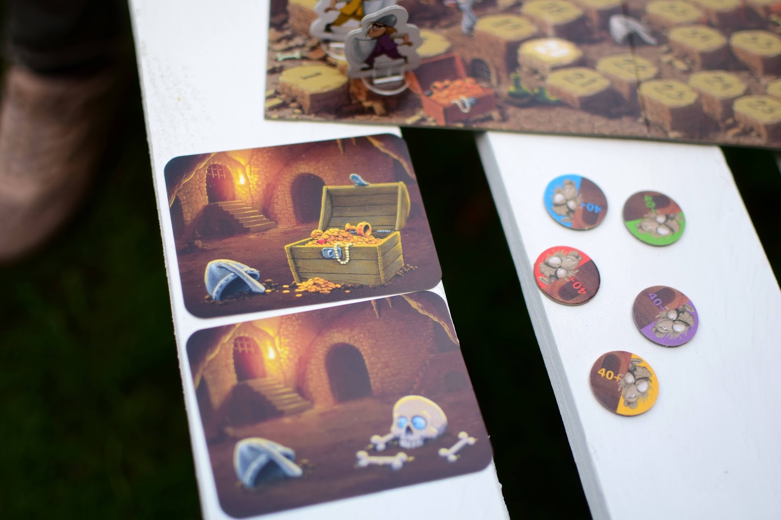 W pierwszej rundzie, rozkładamy karty na stole lub pozostawiamy w stosiku. My miałyśmy stosik kart na ławce, grałyśmy z Julią na podwórku. Wybrałyśmy swoje pionki, pięć żetonów o wartości 40 pkt położyłam obok planszy. Dla Julii wyjęłam dwie tarcze, które chronią przed spojrzeniem Bazyliszka, dla siebie nie brałam tarczy ochronnej.